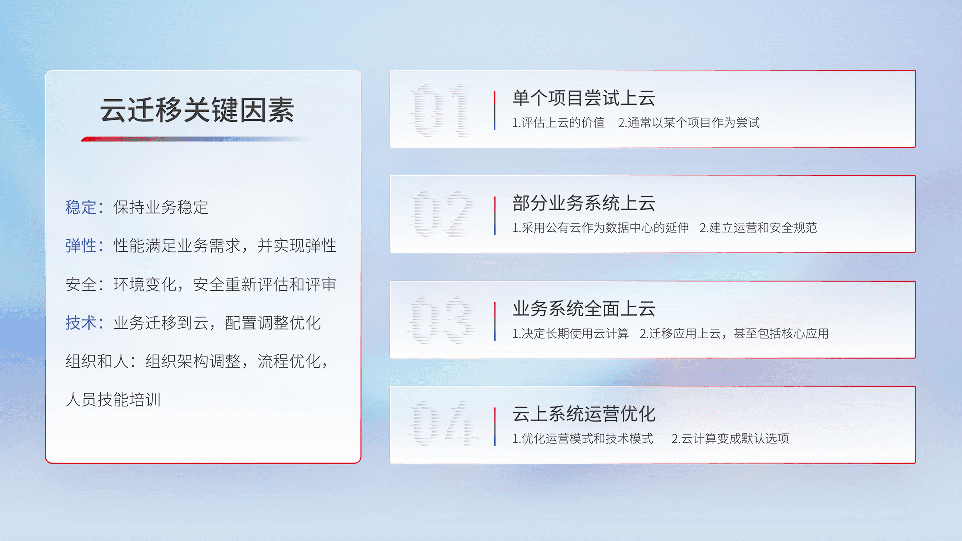 结合实际业务,,,,从规划设计、、、、云平台选型、、、云原生改造、、、数据迁移、、、、集成交付,,,,迁移全过程为客户识别最佳上云路径,,,做好风险识别管理,,设计网络架构、、身份权限、、安全审计合规、、操作审计、、日志审计、、、、监控告警策略、、多站点容灾设计等,,,对云上基础设施进行整体规划,,,提升IT治理水平,,,,以满足弹性、、高可用、、、高性能的需求。。。。