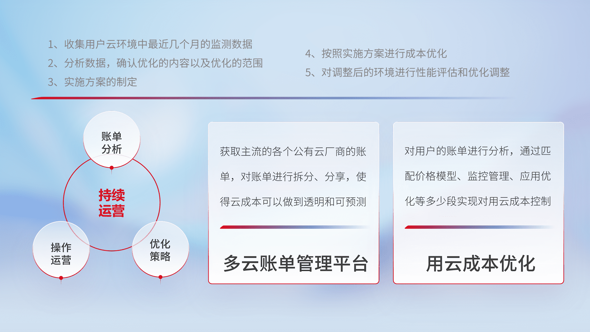 通过多云纳管,,,以统一的资源数据模型把客户的云资源进行抽象和封装,,进而实现对多云资源的统一操作,,保障云资源管理的可靠性、、、、稳定性与可用性。。。量身定制化运维内容,,配置、、、开发运维、、补丁管理、、、、备份、、、、监控、、、认证和访问管理、、、审计和日常巡检等,,,保障在用云过程中的可靠度,,稳定度以及高可用率。。。。